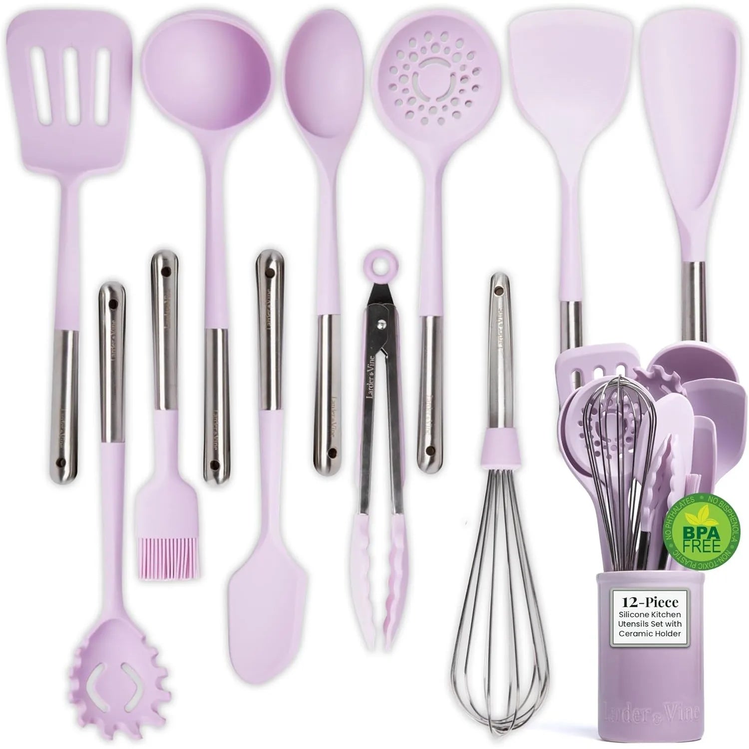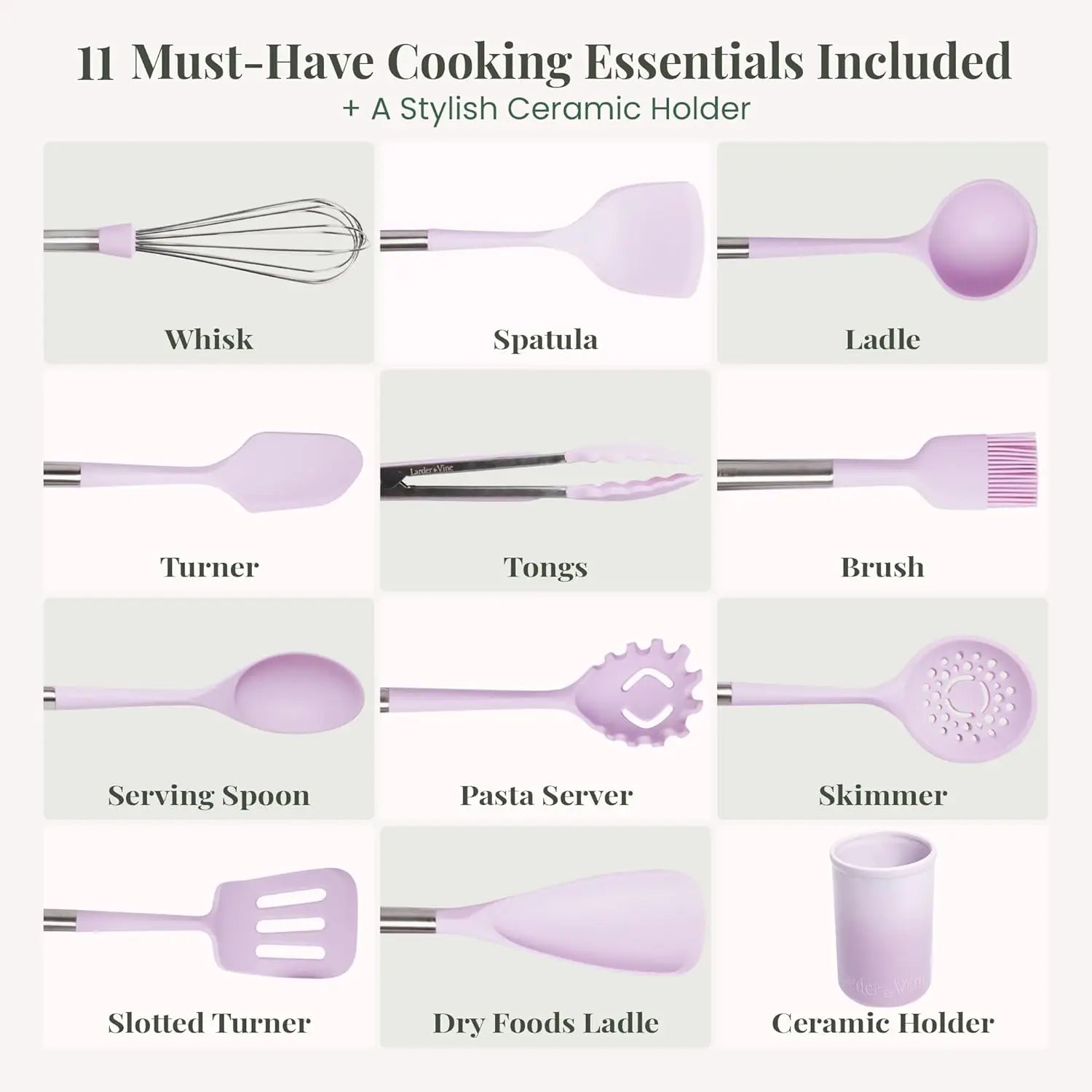 - Complete Kitchen Essential: This 12-piece silicone utensil set meets all your cooking and baking needs, with tools for stirring, whisking, flipping, and more. Includes a ceramic crock for convenient countertop storage.
