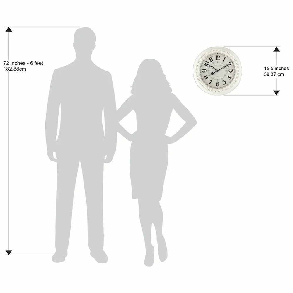 15" White Wall Clock! The clock's dial is encompassed with a beautiful beaded bezel frame, featuring a warm, vintage-white finish that is hand applied. The base of the finish is white and is topped with warm-toned brushstrokes. The lovely parchment style dial continues the vintage farmhouse styling with its traditional Arabic numbers and outer minute track, along with a printed decorative “fleur-de-lis” motif ring at the center of the dial. The hour and minute hands feature a unique shape and are finished in satin black, making them visible against the dial. A glass lens protects the dial and handset. The clock's quality quartz movement ensures precise timekeeping. A diameter of 15. 5” makes this clock’s size substantial enough to be hung upon a wall on its own, but small enough to be hung alongside your existing wall décor should you like as well! The culmination of this wall clock’s decorative accents makes this wall clock full of charm, one that would bring such decorative flair to any home!